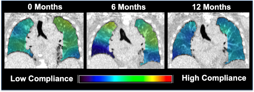 Clinical Applications Clinical Applications The information provided by image processing derived functional inference methods, such as CT-derived functional imaging, can be used to 1) detect the presence of disease, 2) quantify disease severity and progression, 3) evaluate treatment effectiveness, and within the context of cancer radiotherapy, radiation-induced injury. The figure above uses CTFI methods to illustrate the disease progression of interstitial pulmonary fibrosis. Selected Publications on Clinical Applications Yevgeniy Vinogradskiy, Richard Castillo, Edward Castillo, Leah Schubert, Bernard Jones, Austin Faught, Laurie Gaspar, Jennifer Kwak, Daniel Bowles, Timothy Waxweiler, Jing Jingjing Dougherty, Dexiang Gao, Craig Stevens, Moyed Miften, Brian Kavanagh, Inga Grills, Chad Rusthoven, and Thomas Guerrero. Results of a Multi-Institutional Phase II Clinical Trial for 4DCT-Ventilation Functional Avoidance Thoracic Radiotherapy, International Journal of Radiation Oncology, Biology, Physics. In Press, 2021.Filip Ionescu, Markie Zimmer, Ioana Petrescu, Edward Castillo, Paul Bozyk, Amr Abbas, Lauren Abplanlb, Sanjay Dogra, and Girish Nair. Extubation Failure in Critically Ill COVID-19 Patients: Risk Factors and Impact on In-Hospital Mortality. Journal of Intensive Care Medicine,36(9): 1018-1024, 2021.Girish Nair, Sayf Al-Katib, Danielle Turner-Lawrence, Majd Khasawneh, Nicholas Myziuk, Thomas Guerrero, Robert Podolsky, and Edward Castillo. A Prospective Study to Characterize Pulmonary Blood Mass Changes on Non-Contrast 4DCT in Pulmonary Embolism Patients. Clinical Imaging, 78: 179-183, 2021.Girish Nair, Sayf Al-Katib, and Edward Castillo. Pulmonary Blood Mass and Quantitative Lung Function Imaging in Idiopathic Pulmonary Fibrosis. Radiology: Cardiothoracic Imaging, 2(3): e200003, 2020.Girish Nair, Edward Castillo, Nicholas Myziuk, Inga Grills, Craig Stevens, and Thomas Guerrero. Differential Ventilation Pattern on Novel Functional Imaging in a Patient with Unilateral Bronchial Obstruction Caused by Adenoid Cystic Carcinoma. American Journal of Respiratory and Critical Care Medicine. In Press, 2019.Girish Nair and Edward Castillo. Longitudinal Lung Compliance Imaging in Idiopathic Pulmonary Fibrosis. Radiology. 293(2): 272-272, 2019.Yevgeniy Vinogradskiy, Chad Rusthoven, Leah Schubert, Bernard Jones, Austin Faught, Richard Castillo, Edward Castillo, Laurie Gaspar, Jennifer Kwak, Timothy Waxweiler, Michele Dougherty, Dexiang Gao, Craig Stevens, Moyed Miften, Brian Kavanagh, Thomas Guerrero, and Inga Grills. Interim Analysis of a Two Institution, Prospective, Clinical Trial of 4DCT-Ventilaiton-Based Functional Avoidance Radiation Therapy. International Journal of Radiation Oncology, Biology, Physics, 102(4): 1357-1365, 2018.Austin Faught, Tokihiro Yamamoto, Richard Castillo, Edward Castillo, Jingjing Zhang, Moyed Miften, and Yevgeniy Vinogradskiy. Evaluating which Dose-Function Metrics are Most Critical for Functional-Guided Radiotherapy with CT Ventilation Imaging. International Journal of Radiation Oncology, Biology, Physics, 99(1): 202-209, 2017.Yevgeniy Vinogradskiy, Matthew Jackson, Leah Schubert, Bernard Jones, Richard Castillo, Edward Castillo, Thomas Guerrero, John Mitchell, Chad Rusthoven, Moyed Miften, and Brian Kavanagh. Assessing the Use of 4DCT-Ventilation in Pre-operative Surgical Lung Cancer Evaluation. Medical Physics, 44(1): 200-208, 2016.Richard Castillo, Ngoc Pham, Edward Castillo, Samantha Aso-Gonzalez, Sobiya Ansari, Brian Hobbs, Diana Palacio, Heath Skinner, and Thomas Guerrero. Pre–Radiation Therapy Fluorine 18 Fluorodeoxyglucose PET Helps Identify Patients with Esophageal Cancer at High Risk for Radiation Pneumonitis. Radiology, 275(3): 822-831, 2015.