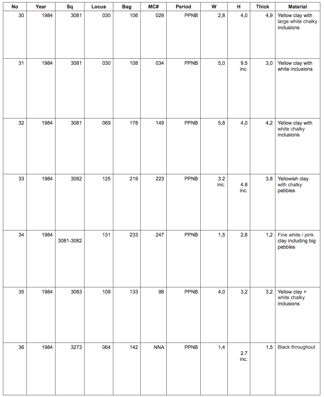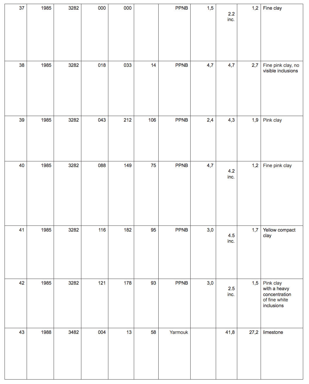 Thin-section analysis determined that the six figurines that are not made of clay were carved from a soft marly limestone common in Jordan (Kafafi 1986: 57-61). Among these figurines, two belong to the MPPNB period (Cat. Nos. 15-16). A single one dates from the LPPNB and another one from the PPNC (Cat. Nos. 48- 49). Finally, the last two are Yarmoukian (Cat. Nos. 43-47).