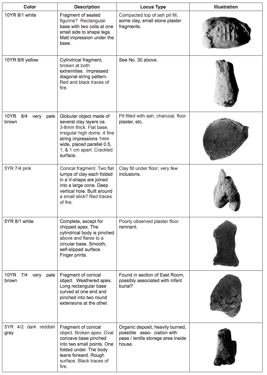 Thin section analyses, performed under the direction of Dr. Mustafa Al-Naddaf, Director of the Yarmouk University Archaeological Laboratory, Irbid, on three yellow and reddish fragments, determined that firing was not part of the manufacture of the figurines. (The samples numbers from 1983 season of excavation are as follows: 3073–bag 223, Locus 004, MC 315; 3077–bag 90, locus 028, MC 37 (a shapeless yellow fragment next to conical figurine No. 10); 307–bag 235, locus 076A, MC302; 3079–bag 345, locus 084, MC 325). Nonetheless multiple figurines present evidence for direct contact with fire and, in particular: