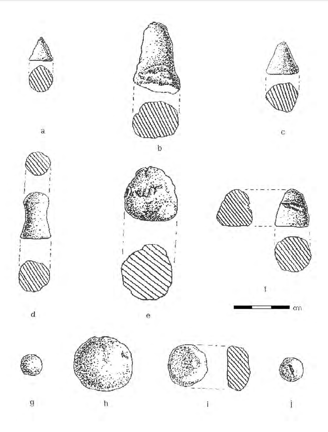 By far the largest category of shapes consists of spheres. “Simple” spheres (n=76) make up 55% of the collection (Fig. 2.1.2[g]). These range from finely smoothed and precisely rounded objects to crudely made ones with generally rounded shapes. These differences presumably reflect a combination of the care with which they were made, raw materials utilized, and post-depositional conditions. Spheres range between 1.0 and 3.4 cm in diameter, with a median of 2.1 cm. Several rounded clay or stone objects with dimensions greater than 3.0 cm were considered too large to be classified as tokens and were removed from the study. A small number of larger rounded specimens (3.1-3.4 cm), however, that appear to belong to groups of tokens or, in one case, with token-like markings, remain in this category (Fig. 2.1.2[h]). The only subtype defined by shape is the “half sphere” (Fig. 2.1.2[i]) (n=8), one of which has a groove.