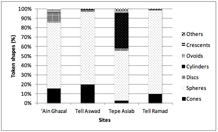 Levels I and II at Tell Ramad, also in Syria, date to the late seventh and early sixth millennium BC within the PPNB period. The token collection from this site is one of the largest available for study, with 380 specimens. It differs from the other three assemblages in the overwhelming predominance of spheres (88%), with cones constituting 10% and other shapes less than 2% of the collection. There are no stone tokens in this collection.