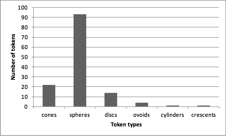 The objects are classified by shape according to the main types and subtypes described in Schmandt-Besserat 1992 (vol. II: ix-xv). Figure 2.1.1 illustrates the numbers of token types present in the ‘Ain Ghazal assemblage according to this classification.