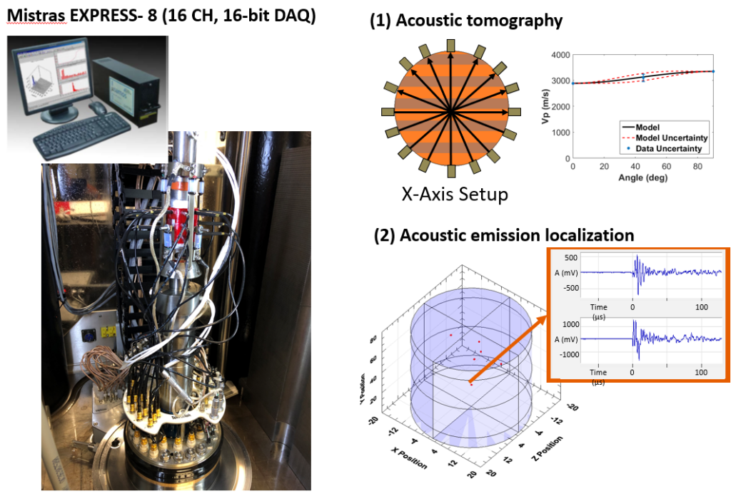 High-pressure high-temperature triaxial frame The triaxial load frame apparatus is composed by: (1) the triaxial frame itself including the pressure vessel, (2) pressure intensifiers to control radial and axial stress, (3) accumulators and injection pumps, and (4) a control panel and acquisition system. Components (1), (2), and (4) have been manufactured by TerraTek Rock Mechanics and Core Analysis Services. Component (3) has been manufactured by an ISCO and by Phoenix Instruments (Limited to 35 MPa). The triaxial cell can host rock specimens ranging in size 1”, 1.5”, 2”, and 4” diameter (Figure 2). Endcaps are equipped with ultrasonic transducers. Maximum working pressure and temperature are 140 MPa and 150°C respectively. The setup is located at the Energy Geomechanics Applied Laboratory (EAGLe) in CPE building on the campus of the University of Texas at Austin. The following research papers benefited from this device: – Training videos (UT access only) 01. Sample Setup by Matt Ramos 02. Sample Setup by Matt Ramos 03. Sample Setup by Matt Ramos 04. Sample Setup by Matt Ramos 05. Sample Setup by Matt Ramos 06. Sample Setup by Matt Ramos 07. Sample Setup by Matt Ramos 08. Running Triaxial Test by Matt Ramos 09. Opening Vessel and Shutdown by Matt Ramos 10. Starting Pulser and Oscilloscope by Nicolas Espinoza 11. Starting Terrawave and Saving Setups by Nicolas Espinoza 12. Data acquisition by Nicolas Espinoza