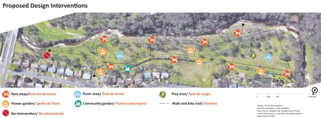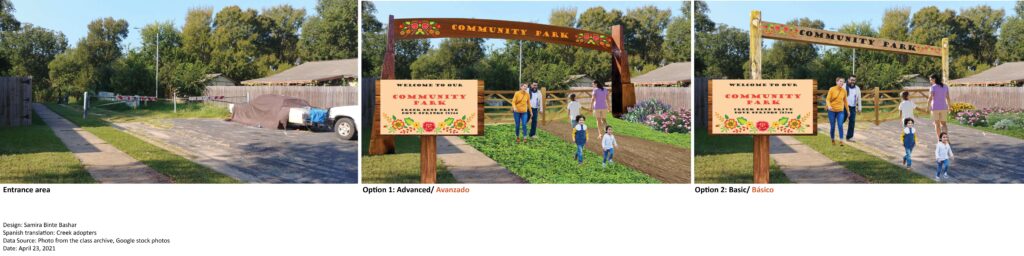 Community members suggested erecting interpretive signs throughout the park in their interviews and pit-stop walks. We carried this idea forward with a preference survey held during a community-based workshop to finalize themes for the signs. Residents preferred interpretive signs about memories (such as the history of Dove Springs and how the community evolved), culturally significant elements (such as information about Mexican native plants that community members grow in their gardens), and youth education (such as information about park maintenance and wildlife preservation).
