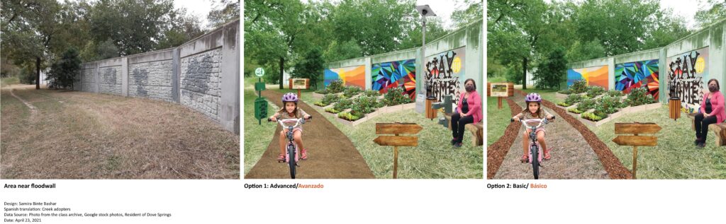 This is a small, cozy space near the flood wall where the brush has already been cleared. Residents want to see a rest stop and community garden space installed here with interpretive signs and a mural design on the floodwall. (The mural design and interpretive signs are for illustrative purposes only. Please refer to mural and interpretive sign themes above.) The ‘Advanced’ option includes a trash receptacle with doggy bags for dog owners, a solar-powered light, a water fountain, and a decomposed granite trail. The ‘Basic’ option only includes a trash bin and a grass-covered trail bordered with mulch to prevent grass and weeds from entering.