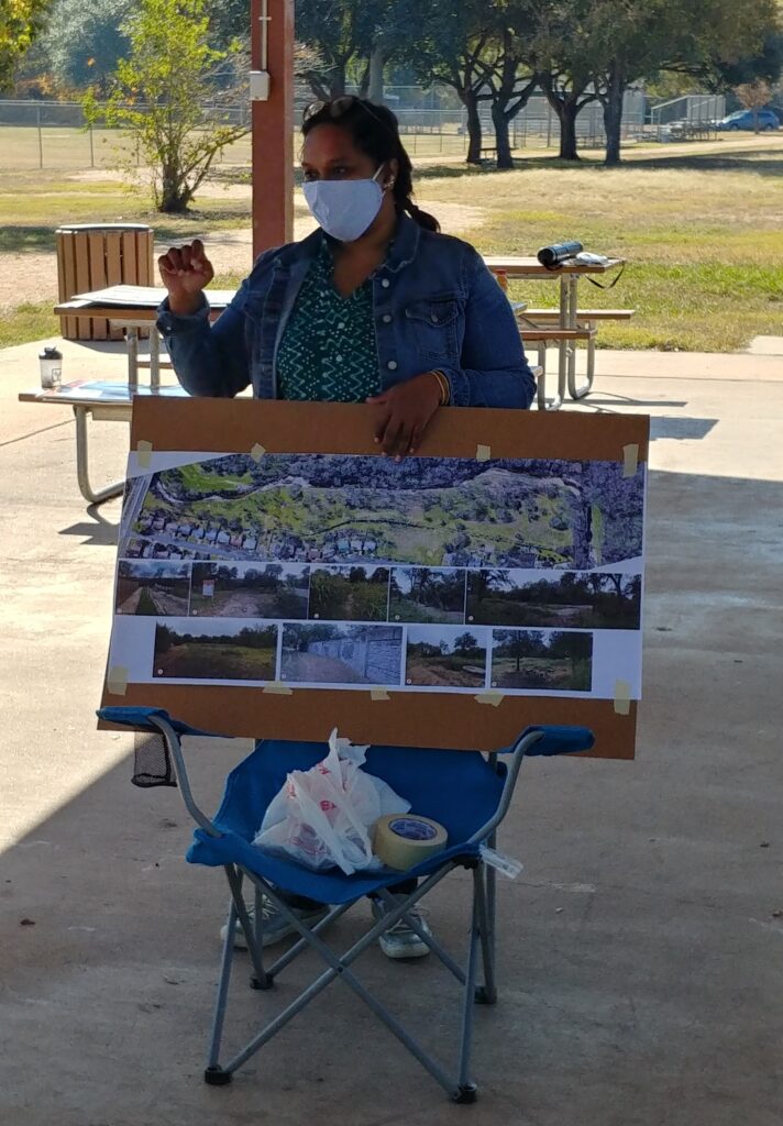 We mapped out a 45-minute loop trail with nine “pit stops” that covered nearly the entire perimeter of the site, ensuring that significant landscape features were represented in at least one stop. Starting at the trailhead entrance at Creek Bend Drive, we asked participants to respond to questions when prompted but also to share spontaneous thoughts as they walked the trail.