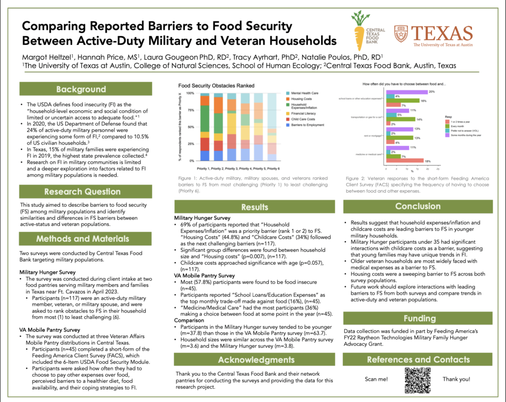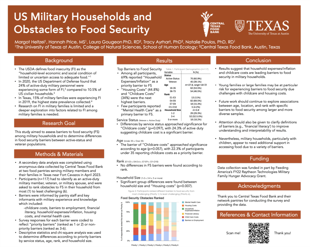May 1, 2025, Filed Under: PostersStudent Poster Presentation Congratulations to one of our undergraduate researchers, Margot Heltzel, who presented her research at the 2025 Texas Academy of Nutrition and Dietetics Conference and the 2025 UT Undergraduate Research Symposium. Her research focuses on reported obstacles to food security in US Military Households in Texas.