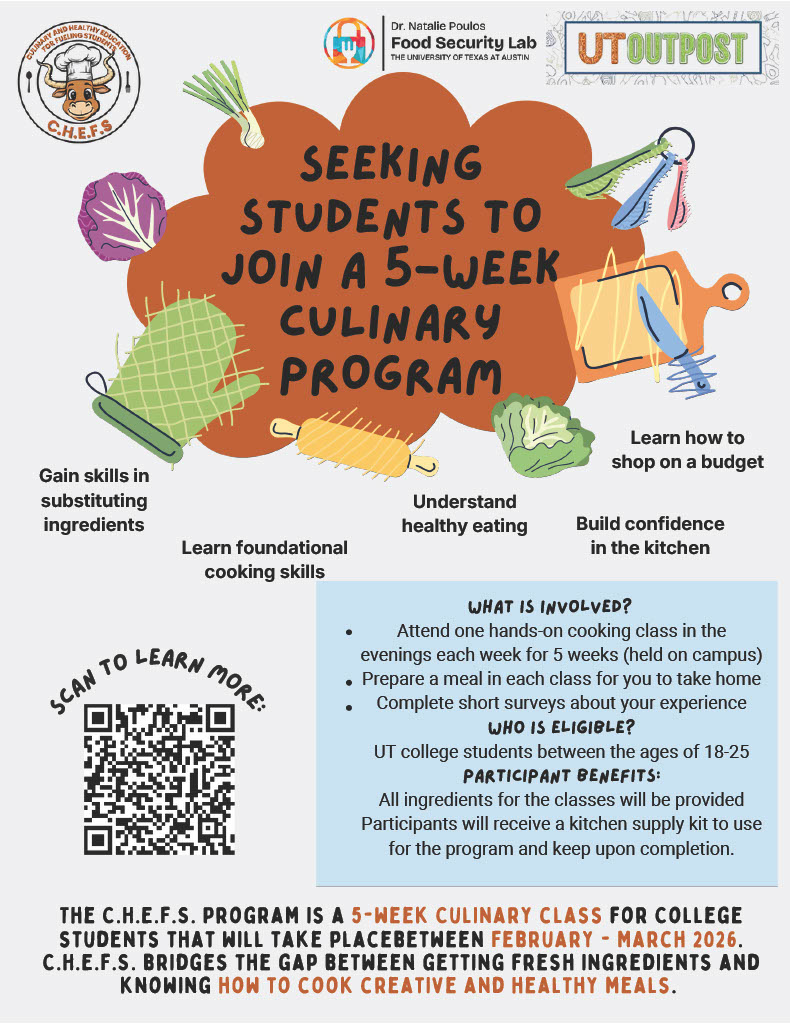 C.H.E.F.S – Culinary and Healthy Education for Fueling Students Study Overview Approximately 3.8 million college students in the United States experience food insecurity (FI), which can negatively impact academic performance, health, and overall well-being. Evidence suggests that many students lack basic culinary skills and nutrition knowledge needed to prepare balanced, affordable meals. Although the rates of FI have been investigated among this population, very few interventions have been created to address building culinary efficacy and addressing food insecurity. This research aims to investigate the impact and feasibility of a 5-week pilot culinary intervention program at a large university. Specifically, this study aims to: Increase fruit and vegetable consumption among college students experiencing food insecurity Improve college student culinary self-efficacy around basic cooking skills We hypothesize that participation in a 5-week culinary intervention will improve dietary intake and culinary efficacy among college students at a large university. Partners This work is proudly supported by the Moritz Center for Societal Impact in the School of Social Work. Food Security Lab PhD students, Lauren Bell and Madilyn Bradley, were awarded a $5,000 grant to support their proposed project, CHEFS: Culinary and Healthy Education for Fueling Students, at the inaugural Social Impact Challenge in Fall of 2025. Participation