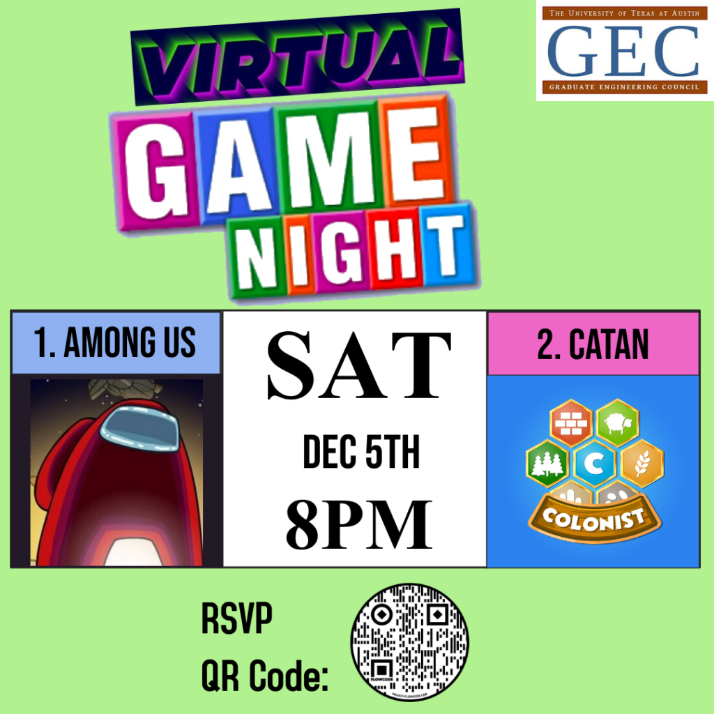 Fall 2020 Events Fall 2020 Events Updated on Dec. 1st Upcoming Events Virtual Game Night (SAT 8PM, Dec. 5th) Join us as we host games of Among us and Catan over Zoom simultaneously! Play either or both! RSVP Graduate and Industry Networking (GAIN) (Feb. 25th of 2021) Come listen to talks from industry and spend quality time company representatives looking to recruit YOU! Recent Events Failure Seminar Series (Nov.) Graduate school is filled with failures, you’re not alone! Career Paths in Industry (w/ National Labs) (Nov.) Speakers: Dr. Jaydeep Kulkarni and Dr. Blair Johnson Trivia Nights (Sep., Oct., and Nov.) Are you a master of random knowledge? Show us what you’ve got! Halloween Movie Night (Oct. 31st) Interested in virtually watching a great Halloween movie together? Pumpkin Carving Contest (Oct. 31st) Share your photo of the scariest pumpkin to win free pizzas! Winner: Brielle Hohne – COVID-19 Pumpkin Sustainability on Tap (Oct.) Interested in giving a 3 minute talk about your sustainability related research or passion? Apply HERE! GEC at Gone to Engineering (Aug.) Learn more about GEC, grad school, UT, or life here in Austin. Come say hi!