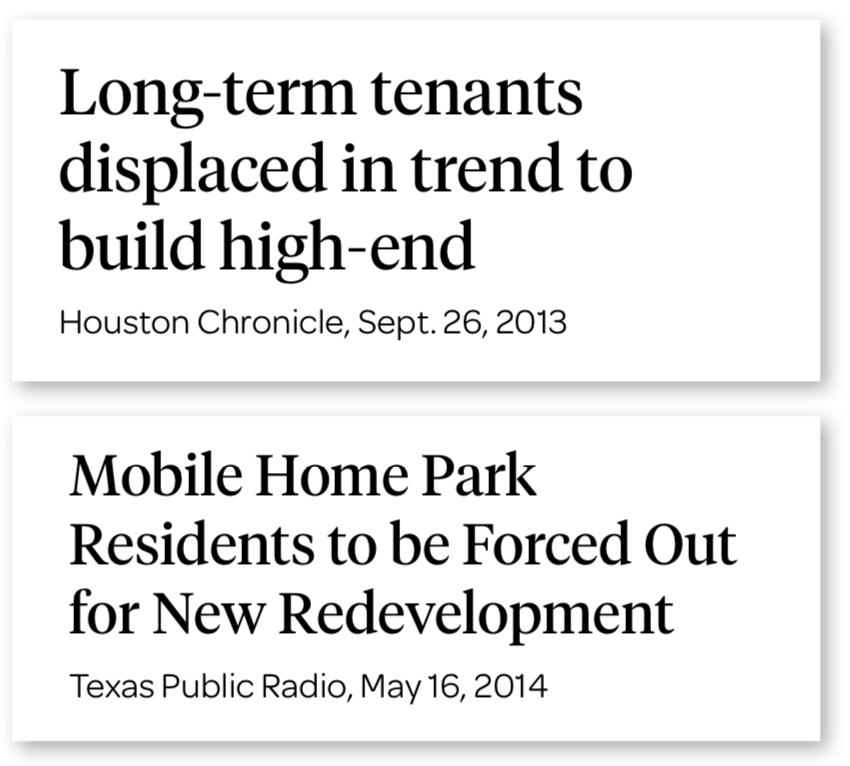 Another group of highly vulnerable rental properties in gentrifying neighborhoods are mobile home parks. Texas has recently lost a number of mobile homes due to gentrification pressures, and many more are likely to be lost without intervention.