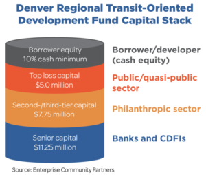 Successful funds focused on preservation of affordable rental housing near transit have been created in the Bay Area and Denver. The Denver Regional Transit-Oriented Development Fund and The Bay Area Transit-Oriented Affordable Housing Fund began with $10 million to $13.5 million in capital from public agencies, later expanding to include equity from banks, community development financial institutions, and foundations.
