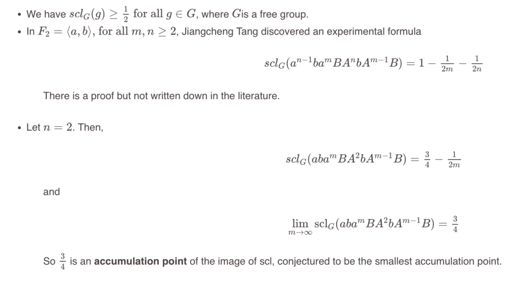 Calegari’s rationality theorem shows that scl only takes rational values in free groups. However, it is not known which rational numbers appear as scl values. The set of such numbers is called the scl spectrum for the free group. The algorithm in the theorem was implemented in the scallop program (later improved by Alden Walker), which allowed computer experiments to explore scl in free groups. The following histogram indicates part of the scl spectrum in the free group of rank two based on computer experiments.