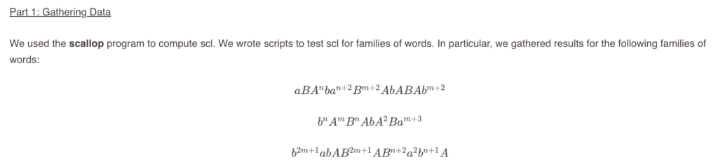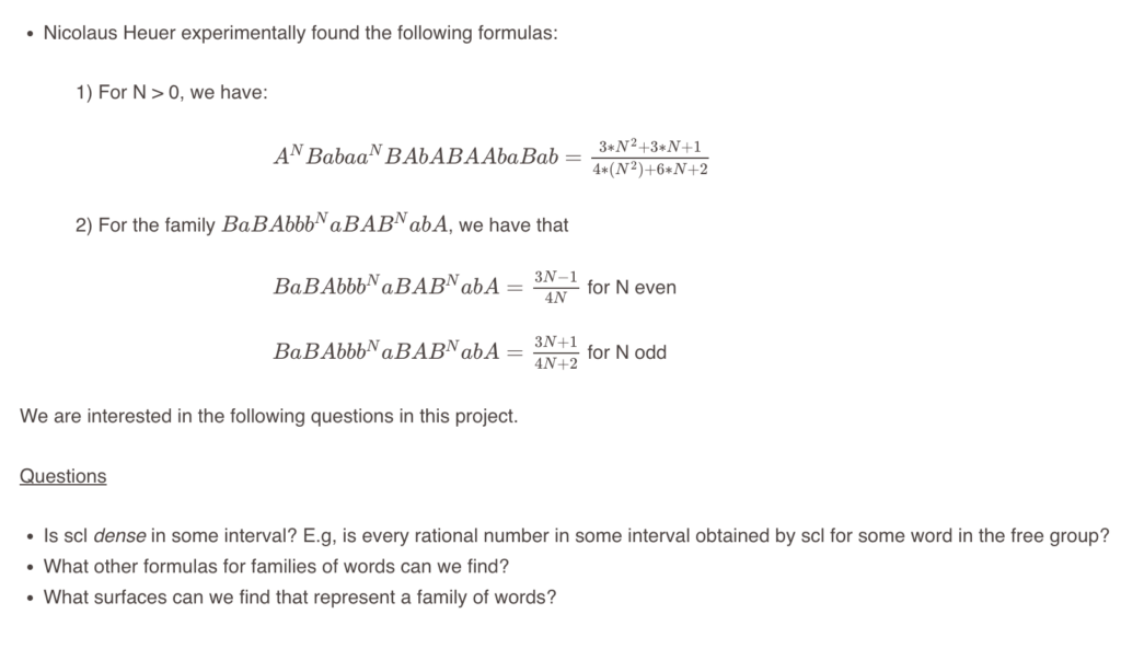 Our goal is to experimentally explore scl in families of words, specifically in free groups, to better understand the conjecture above as well as the open questions below. In addition, we would like to prove some explicit formulas for scl on families of words. This is related to finding the extremal surfaces (i.e. achieving the infimum in the topological definition) corresponding to such families.