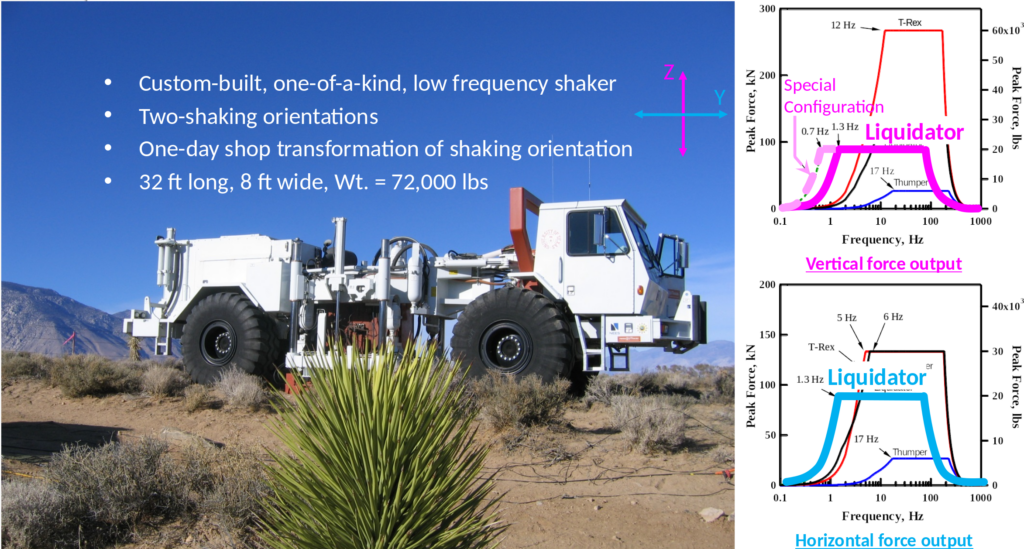 Field Testing T-Rex T-Rex is a tri-axial hydraulic mobile shaker. It can generate large dynamic forces in any of three directions (vertical, horizontal in-line, and horizontal cross-line), where the shaking direction can be changed with a simple push of a button by the operator. The shaking system, mounted on an off-road, all-wheel-drive vehicle, can produce a maximum force output of around 267 kN in the vertical direction, and around 134 kN in each horizontal direction, respectively. Liquidator Liquidator is a unique, custom-built shaker designed specifically for low-frequency operation. The shaker can generate a maximum force output of approximately 89 kN down to a frequency of 1.3 Hz. In a new modified configuration where the entire off-road mobile platform is lifted off the ground and oscillates in the vertical mode, Liquidator can generate maximum forces of 89 kN down to a frequency of 0.7 Hz. This modification provides unique capabilities that can facilitate deeper (1 km or more) active-source subsurface imaging. Thumper Thumper is built on a street-legal truck and has a moderate force output, making it ideal for testing in urban areas. The maximum force output of Thumper in the vertical or horizontal directions is about 27 kN. With around two hours of work in the field, Thumper’s shaking direction can be changed at the test site.