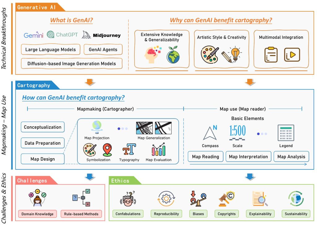 Future Cartography Can AI help make maps that are both accurate and beautiful? The GISense Lab has been pioneering AI in cartography for decades. Our work ranges from the seminal Map Style Transfer that uses Generative Adversarial Networks to learn cartographic styles from existing maps and art and reapply them across multiscale maps, to a comprehensive Review of GeoAI for cartography, a Perspective of Generative AI for cartography, an Ethical Framework of AI-generated maps, and the next generation AI-assisted map design Agentic system CartoAgent. Together, these projects provide a path for how GeoAI can be integrated into mapmaking practice. A demonstration of map style transfer (Wang et al., 2025) A framework of Artificial Intelligence for cartography (Kang et al., 2024) A framework of Generative AI for cartography (Kang et al., 2026) Looking forward, AI is not only a black-box map generator, but also a co-designer that helps empower human creativity and encode cartographic expertise to create ethical and visually appealing maps. Beyond research, Dr. Kang teaches Cartography and Maps at UT-Austin. Students not only learn traditional practices of mapmaking, but also integrate AI to train a new generation of cartographers. References Kang, Y., Gao, S. and Roth, R.E., 2019. Transferring multiscale map styles using generative adversarial networks. International Journal of Cartography, 5(2-3), pp.115-141. Kang, Y., Gao, S. and Roth, R.E., 2024. Artificial intelligence studies in cartography: a review and synthesis of methods, applications, and ethics. Cartography and Geographic Information Science, 51(4), pp.599-630. Wang, C., Kang, Y., Gong, Z., Zhao, P., Feng, Y., Zhang, W. and Li, G., 2025. CartoAgent: a multimodal large language model-powered multi-agent cartographic framework for map style transfer and evaluation. International Journal of Geographical Information Science, pp.1-34. Kang, Y. and Wang, C., 2025. Envisioning Generative Artificial Intelligence in Cartography and Mapmaking. arXiv preprint arXiv:2508.09028 Zhang, Q., Kang, Y. and Roth, R., 2023. The Ethics of AI-Generated Maps: DALL· E 2 and AI’s Implications for Cartography (Short Paper). In 12th International conference on geographic information science (GIScience 2023) (pp. 93-1). Schloss Dagstuhl–Leibniz-Zentrum für Informatik. Kang, Y., Rao, J., Wang, W., Peng, B., Gao, S. and Zhang, F., 2020, May. Towards cartographic knowledge encoding with deep learning: A case study of building generalization. In Proceedings of the AutoCarto (pp. 1-6). Kang, Y., Wang, C., Feng, Y., Touya, G. and Kim, J., 2025. Artificial Intelligence for Cartography and Maps. In GeoAI and Human Geography: The Dawn of a New Spatial Intelligence Era (pp. 219-237). Cham: Springer Nature Switzerland.