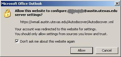4) If this fails, the client will check for a redirect by performing a GET request against the URL http://autodiscover.<smtpdomain>/Autodiscover/Autodiscover.xml , which paves the way for the workaround we have implemented in our environment, described below. (This is where the aforementioned dialog box gets invoked in our environment, as Outlook must ask the user if the redirect can be trusted.) Again, each failed URL guess results in another delay as the client waits for the attempt to timeout and fail.
