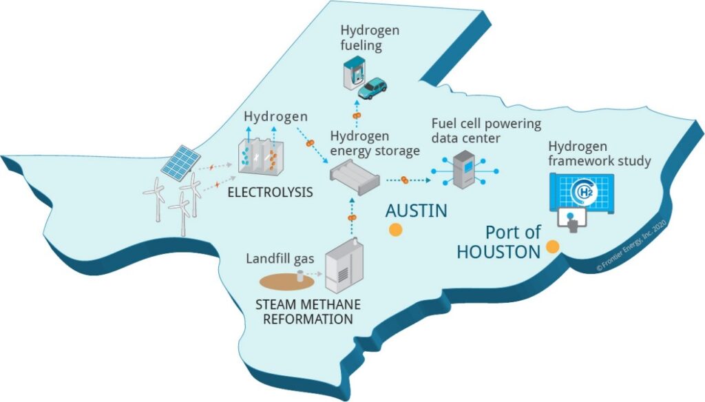 Frontier Energy, Inc., in close collaboration with GTI and The University of Texas at Austin, announces the launch of a U.S. Department of Energy project, Demonstration and Framework for H2@Scale in Texas and Beyond. The project is supported by DOE’s Hydrogen and Fuel Cell Technologies Office within the Office of Energy Efficiency and Renewable Energy. H2@Scale in Texas and Beyond intends to show that renewable hydrogen can be a cost-effective fuel for multiple end-use applications, including fuel cell electric vehicles, when coupled with large, baseload consumers that use hydrogen for clean, reliable stationary power.