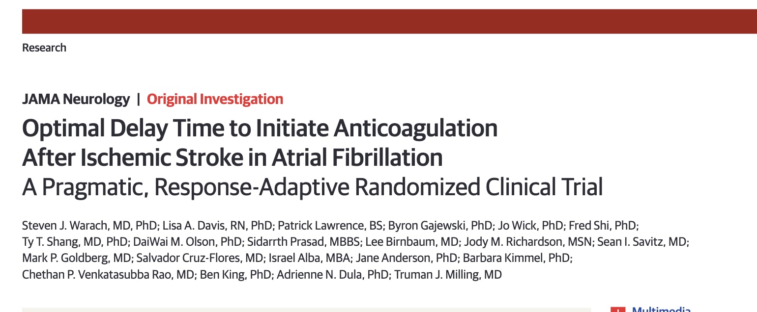 Findings In this phase 2, response-adaptive randomized clinical trial, none of the 4 groups met statistical criteria as the optimal day for treatment initiation. Group 1 (initiation of a direct oral anticoagulant 3-4 days after atrial fibrillation–associated ischemic stroke for secondary stroke prevention) had no ischemic events and the highest posterior probability (0.41) of being optimal for