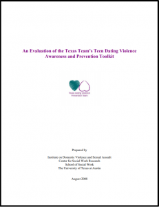 Teen Dating Violence (2008) This research, funded by the Texas Council on Family Violence (TCFV) evaluated the process and outcomes of the implementation of the Teen Dating Violence Awareness and Prevention Toolkit. IDVSA found that implementation of the toolkit was successful at increasing the number of students who were aware of the issue, able to identify abusive behaviors, and knew of a local organization and hotline that could provide assistance. Learn more… Report An Evaluation of the Texas Team’s Teen Dating Violence Awareness and Prevention Toolkit (PDF) Research Team Noel Busch-Armendariz Karen Kalegis Alison Little Hyeyoung Woo Jacqueline Garza Tiffany Ross