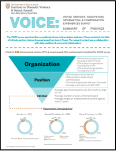 Victim Services Occupation, Information, and Compensation Experiences Survey (2017) The VOICE Survey (Victim Services Occupation, Information, & Compensation Experiences Survey) examines the experiences of people working in the fields of intimate partner violence and sexual assault services. This survey measured occupational stress and gathered perceptions of positions and organizations as well as suggestions for improving job satisfaction. Specifically, the survey asked questions to understand turnover intention, job satisfaction, resiliency, burnout, and secondary traumatic stress. This project was conducted by IDVSA in collaboration with state and community partners and funded by the Office of the Governor, Criminal Justice Division. Reports VOICE Technical Report VOICE Summary of Findings Research Team Leila Wood Anna Wasim