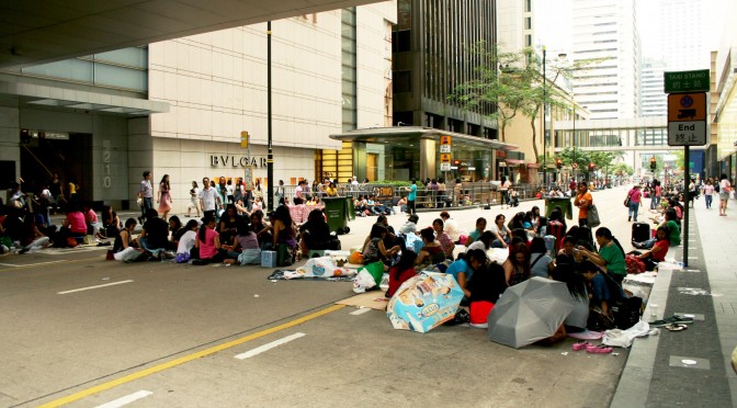 While it can be argued that these gatherings of domestic workers in Hong Kong are a sign of empowerment, they can also be understood as a symptom of “the prevailing gender division of labor, as well as the existing dichotomization of state and family responsibilities, respectively, for formal economic production and informal social reproduction” (Wee & Sim, 2003, p. 3). That is to say, the demand for labor by Hong Kong’s growing service sector and the high cost of living in global financial center combine to create the conditions where both adults in a household must work. This initiates a commodification chain of reproductive labor whereby women entering the workforce in Hong Kong purchase the low-wage labor of Filipina domestic workers (and others from SE Asia) who, in turn, themselves purchase the even lower-wage labor of poorer women left behind in the Philippines (Parreñas, 2000). In this way, class relationships are introduced among female workers via the international transfer of caretaking, reinforcing and expanding the existing gender and racial divisions of labor (Parreñas, 2000).