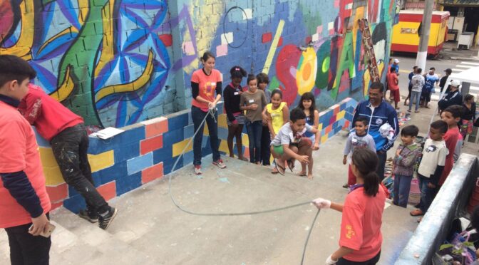 Located in the south of Jardim Angela, a community known as Fundão do Jardim Angela is home to one of many educational initiatives to overcome violence. In 2007, the director of the local public kindergarten EMEI Chácara Sonho Azul formed a partnership with the NGO Associação Cidade Escola Aprendiz in order to develop art projects and cultural activities such as dance and theater performances, seeking to strengthen the students’ bond with the school as an inviting space for parents and the community. At the same time, the EMEI Chácara Sonho Azul emerged as a key center for educational opportunities, integrating learning with everyday urbanism. By developing walking trips for children, professors allow the students to explore their community under safe supervision and learn about the city. For example, taking children to the street market allows children to expand their sense of place while supporting local businesses. The school has also developed an agroforestry initiative that exposes children to gardening, contributing to their nutrition while rescuing local identity and connections with the land.