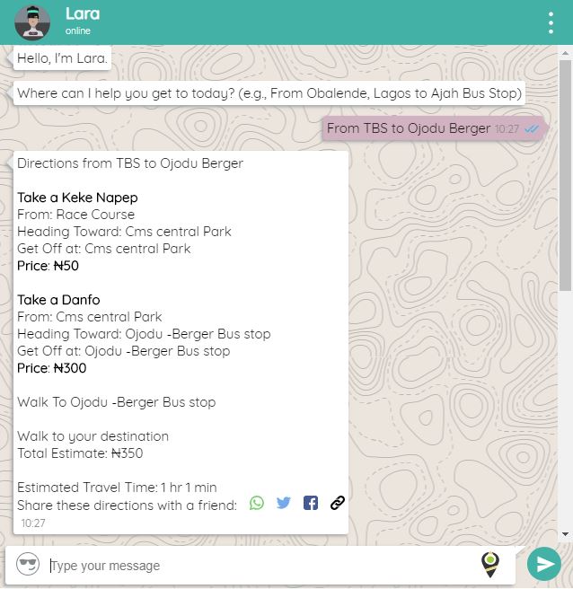 Now, innovative start-ups have begun to experiment with ways to address the public transportation problem with new technologies. With the successful implementation of Uber and Taxify as alternatives to the taxi industry in Lagos, hopes are high for other similar services to revolutionize other modes of transport. Enter lara.ng, a data-lite app that is designed to simplify navigation within the complex danfo network. Users ask a bot (Lara) for directions and Lara will respond within seconds with proposed route(s), transfer locations, and expected bus fares (see Figure 1).