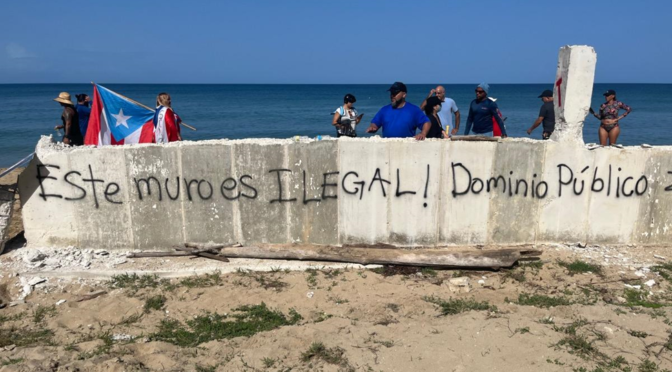 Protesters stand behind a barricade that reads “This wall is illegal! Public domain,” Rincón, Puerto Rico, Monday, July 4, 2022. Source: Photo taken by Carlos Edill Berríos Polanco/Latino Rebels, https://www.latinorebels.com/2022/07/05/rinconbeachprotest/