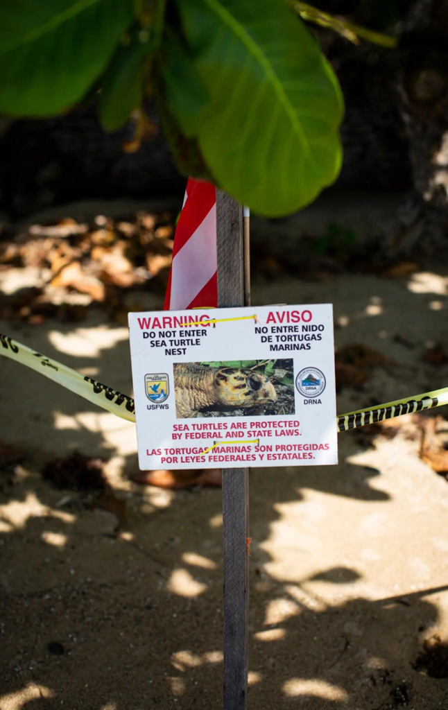 A sign marking a turtle nest next to the wall at the Soly Playa Condominium. Source: Photo taken by Erika Rodriguez, https://www.nytimes.com/2021/11/06/us/puerto-rico-beaches-threats.html