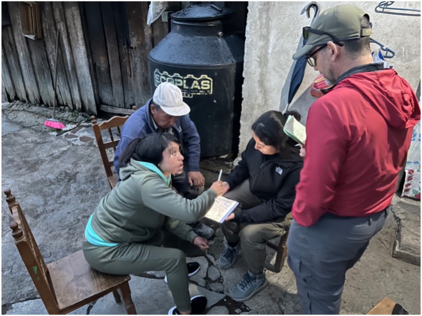 Creating a map of the water distribution network with Canoas Altas residents Don Andrés Andrés Lomelín-Riveraand Anayelli Valdez. Source: Photo taken by Dalia Vazquez and Carlos Ramos-Scharrón