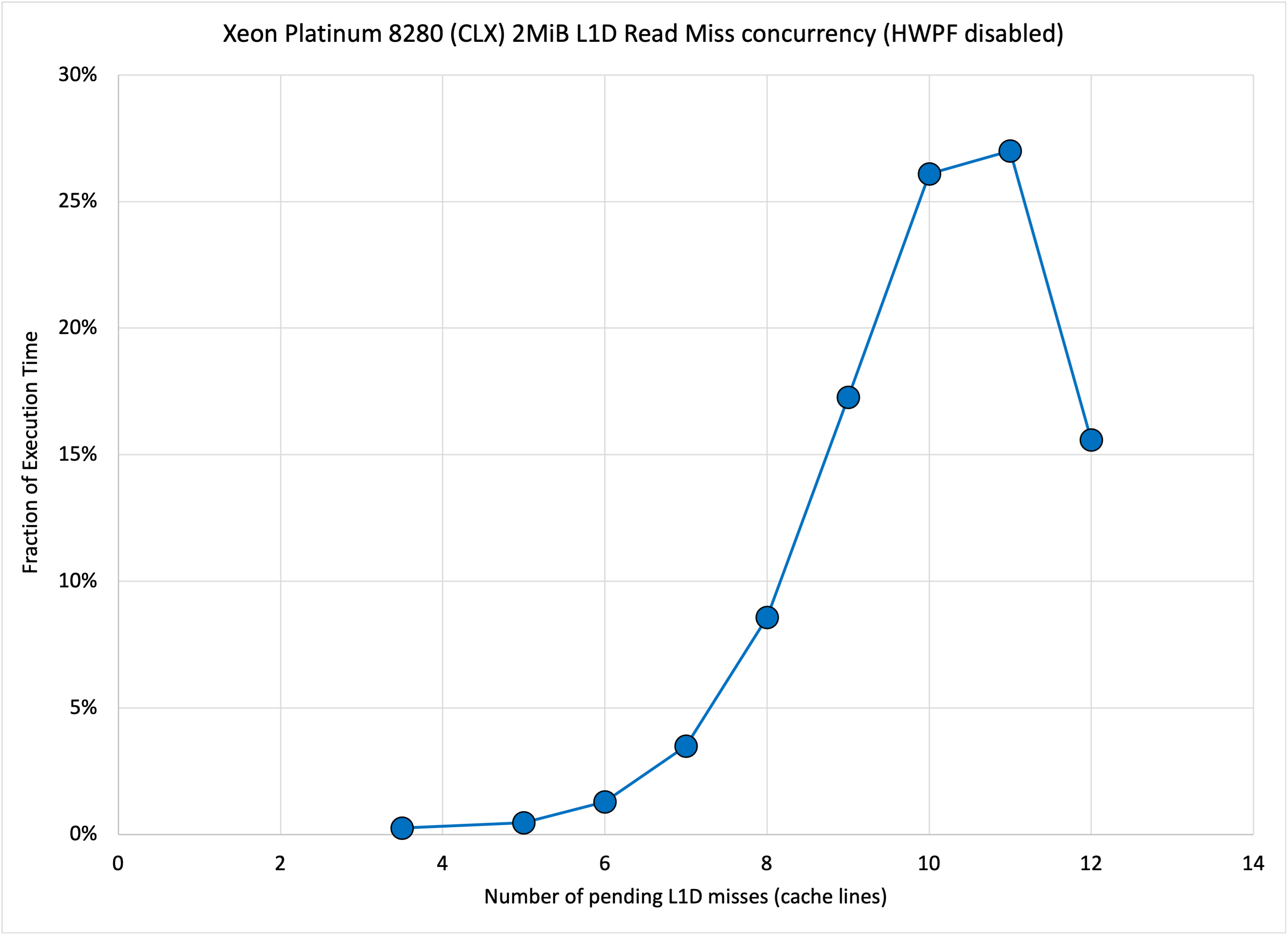Distribution of cycles by number of outstanding L1D misses in each cycle. The weighted average is 10 L1D cache misses outstanding.
