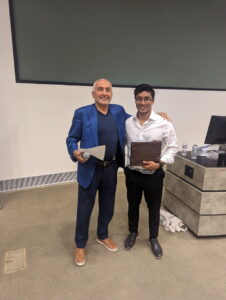 September 1, 2023, Filed Under: NewsKanishka Mitra wins the Attendee’s Choice Award at Interface Rice 2023 Poster Session The CNBI team member Kanishka Mitra, one of our MS students co-supervised by Dr. Ashish Deshpande, won Attendee’s Choice Award for Best Poster at the InterfaceRice 2023 meeting with his poster titled: “Characterising the onset and offset of motor-imagery during passive arm movement induced by an upper-body exoskeleton.”