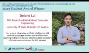 November 6, 2023, Filed Under: NewsDelan Lui wons Dr. Ayyez & Shelena Lalji’s Family student scholar award We are proud to share that Delan won the Dr. Ayyez and Shelena Lalji & Family student scholar award for repair and regenerative mechanism in ALS for “Project integrating artificial intelligence (AI) modules (language models and reinforcement learning) in Brain-computer interfaces (BCI) to restore efficient communications for ALS patients” The award was founded in 2023 in honor of Dr. Ayeez Lalji, who was diagnosed in 2017 and is still bravely and valiantly living with ALS. This award aims to recognize the brightest young scientists in the field of ALS, and to facilitate meaningful research to understand the mechanisms underlying axonal and neuronal repair and regeneration in ALS and/or other neurodegenerative disorders that may be translatable to ALS. “Young bright minds see opportunities not obstacles. They focus on solutions instead of getting stuck on the problems” said Shelena Lalji, F.A.C.O.G,. “My family and I hope to inspire our young scientists to take on ALS and find biological and technological solutions to return true function to people valiantly living with this disease. We are happy to support novel, innovative ideas” Under the supervision of his professor, José Millan, PhD, Deland is recognized as the Lalji Student Scholar for his project integrating artificial intelligence (AI) modules (language models and reinforcement learning) in brain-computer interfaces (BCI) to restore efficient communications for ALS patients. His project exemplifies innovation and understanding of the fundamental knowledge and technology needed to make strides in the fight against ALS. “I express my sincere gratitude to Drs. Lalji and Cudkowicz for this incredible recognition” said Liu. “I am grateful to the support and help from my supervisor, Prof. José del R. Millán, and my lab members. We are inspired by the motivational stories of people fighting against ALS, and we are driven to develop effective treatments and improve their quality of life.” “I offer my sincere congratulations to Deland, and thanks to Drs. Ayeez and Shelena Lalji for making this award possible” said Merit Cudkowicz, MD, MSc, Director of the Healey & AMG Center for ALS and Chief of the Department of Neurology at MGH. “It is young scientists like Deland who will lead the ALS field and contribute to the major breakthroughs we need to cure this disease.” This award is available to undergraduate, graduate, or summer students focused on studying mechanisms of axonal repair, neuronal repair and regeneration applicable to ALS and/or other neurodegenerative disorders. The students must be conducting research, under the direction of a mentor. For more information on the Drs. Ayeez and Shelena Lalji & Family Student Scholar for Repair and Regenerative Mechanisms in ALS, please click here. For more information on the Sean M. Healey & AMG Center for ALS, please visit our website. To learn more about the Lalji Family’s inspiring journey and for more information on the Lalji ALS Foundation, please visit https://alsheroes.com/ Background on ALS Amyotrophic lateral sclerosis, ALS, is the most prevalent adult-onset progressive motor neuron disease, affecting approximately 30,000 people in the U.S. and an estimated 500,000 people worldwide. ALS causes the progressive degeneration of motor neurons, resulting in progressive muscle weakness and atrophy. There are currently few FDA therapies approved for treating ALS—riluzole, edaravone (IV and oral formulation), sodium phenylbutyrate/taurursodiol, and tofersen. Dextromethorphan/quinidine is also used for the symptomatic treatment of pseudobulbar affect (PBA) in people with ALS. About the Sean M. Healey & AMG Center for ALS at Mass General At the Sean M. Healey & AMG Center for ALS at Mass General, we are on a quest to discover life-saving therapies for all individuals affected by ALS. Launched in November 2018, the Healey Center leverages a global network of scientists, physicians, nurses, caregivers, people with ALS and families working together to accelerate the pace of ALS therapy discovery and development. Under the leadership of Merit Cudkowicz, MD and a Science Advisory Council of international experts, we are reimagining how to develop and test the most effective therapies to treat the disease, identify cures and, ultimately, prevent it. The key to our success is our tightly integrated research and clinical efforts, encouraging opportunities to bring the challenges our patients face every day into our laboratories, focusing investigations on finding solutions that will make a meaningful difference to our patients without delay. Our collaborative efforts are designing more efficient and effective clinical trials while broadening access to these trials for people with ALS. See official announcement at https://www.massgeneral.org/neurology/als/news/lalji-student-scholar-award-2023