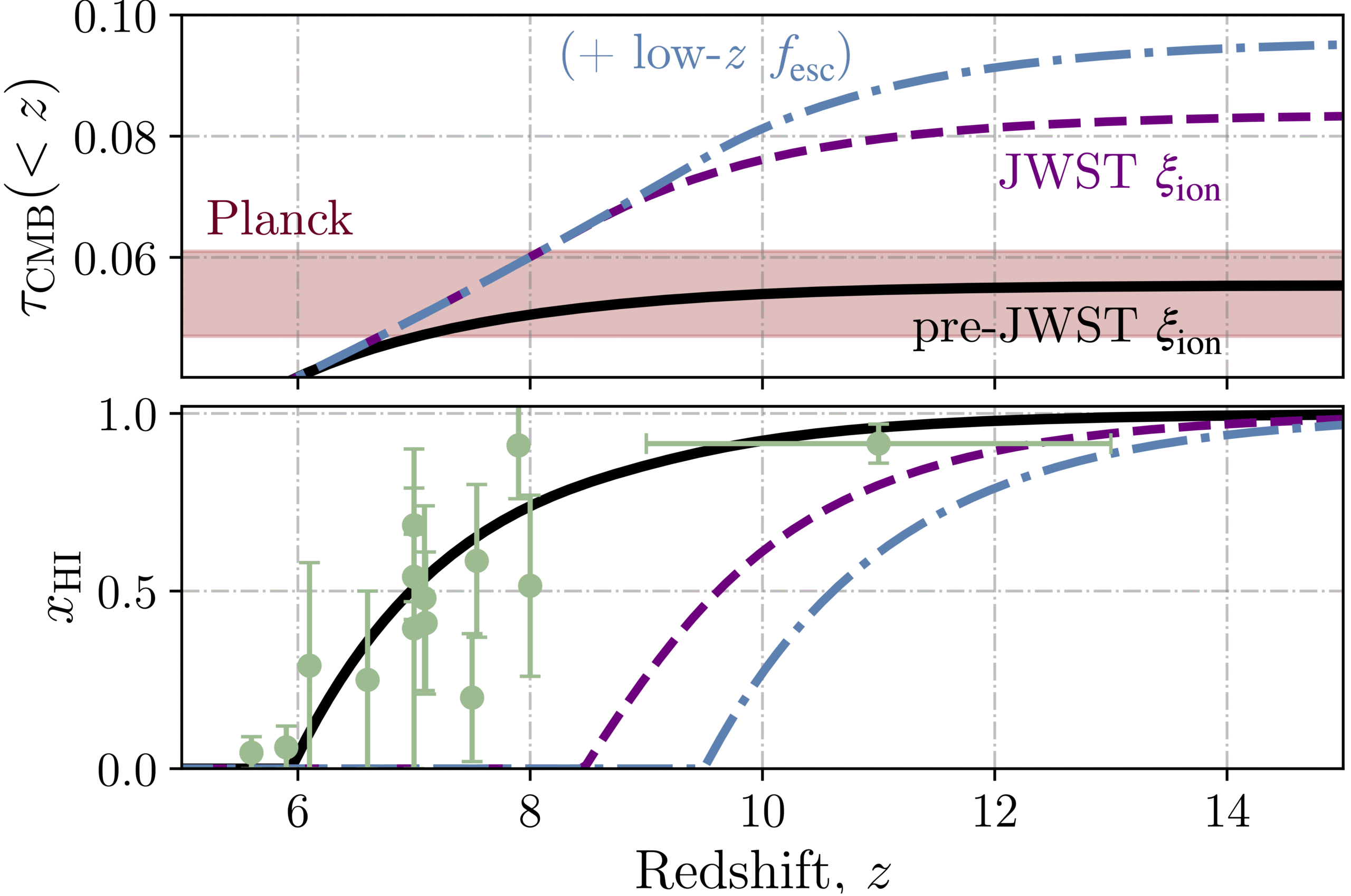 For about a decade we’ve had a sort of consensus on reionization: star-forming galaxies produced just enough ionizing photons to reionize the universe by redshift z~6, matching CMB and Lyman-α forest constraints perfectly. But JWST is upending this picture. In recent work we showed that JWST has found more early galaxies, which are more efficient ionizers, which together creates a “photon budget crisis.” That is, when you add up all the ionizing photons from galaxies we’ve actually observed and those we expect to exist you get too many photons—enough to finish reionization a few hundred million years earlier than expected. Either we’re systematically overestimating how many photons early galaxies produce, we don’t understand escape fractions at all (they’d have to be pretty small, ~few%), or we need to rethink how recombinations work in the early universe (check our Chris Cain’s paper on this!). This tension between JWST galaxy counts and reionization constraints might be telling us something fundamental about the first billion years of cosmic history, and recent work argues that earlier reionization (and larger CMB optical depth) can explain the preference for negative neutrino mass and evolving dark energy in some large-scale structure observations.