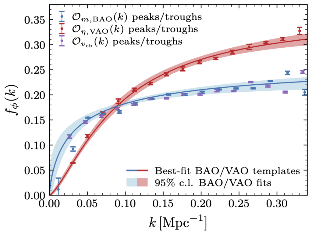 Light relics, even if fully massless, leave a trace by shifting the phase of the BAO phase. But until recently we did not know what they did to VAOs. Grad student Gab Montefalcone and postdoc Hector Cruz used Zeus21 to find how the VAO phase shifts due to Neff. Finding that the shift is actually larger than for BAOs! This is not something we are going to observe tomorrow (we need to detect 21-cm fluctuations first, and the VAOs second), but it provides a new way to test light relics, and confirm that we have seen the correct physics at all redshifts. The phase shift templates are shown below in red for VAOs vs the traditional BAO in blue.