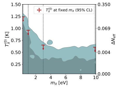 Below are our constraints in the 2D space of relic temperature (directly related to Neff) and mass. The Neff constraint corresponds to the low-mass limit of this plot, and by using the power spectrum we can test heavier relics with even lower temperatures.