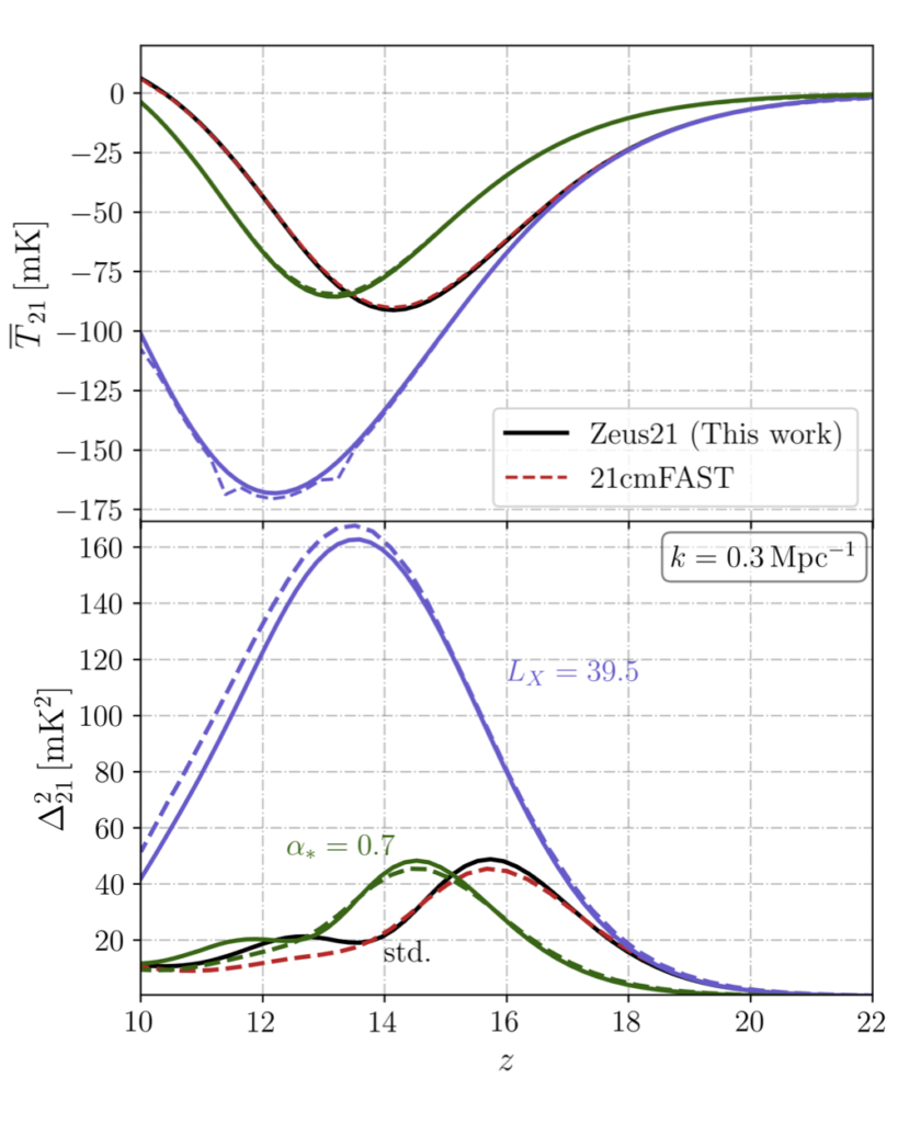Most recently I have introduced an effective model for the 21-cm signal, based on log-normal fields. You can find it in Muñoz23 and in the public software package Zeus21 (Git). This code can reproduce the results of expensive simulations in ~1 s, and gives us a new way to find the evolution of the 21-cm signal across cosmic dawn. To give you an idea, here is the prediction of Zeus21 against the popular 21cmFAST simulations for 3 different astrophysical parameter sets. Top panel shows the global signals, and bottom is the power spectrum at k=0.3/Mpc. Solid lines are Zeus21, which can reproduce the simulations (dashed) really well, and very fast!