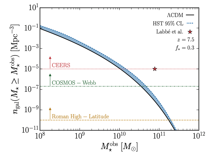 Following on this work, we set out to test if JWST is breaking our cosmological models. In particular we seeked for enhancements of power that could explain the overabundance of ultramassive galaxies claimed to have been observed in JWST (see Labbe+23 and Boylan-Kolchin 23). We used the same HST data (taken over decades!) to show that extra structure formation in a way that would produce more dark-matter halos for JWST at z~5-10 would be in conflict with the HST galaxies. In the left panel below you can see quantitatively how. The 2D posteriors are the power-spectrum enhancement you’d need over LCDM to explain the JWST (blue and green, assuming either 10% or 30% of the gas converts to stars), whereas HST does not allow anything on top of the yellow region. The right panel shows the same information as a function of the density of galaxies above different stellar-mass cuts, where JWST needs to be at the red star, whereas HST only allows to be within (or below) the blue region). In other words, HST does not let you break the universe as much as the claimed JWST galaxies need! The solution may be astrophysical instead, some of the galaxies may host AGNs which make them appear redder (see for example Endsley+23). Paper is here, and it was summarized in the APS magazine Physics here (and other news outlets linked at the bottom).