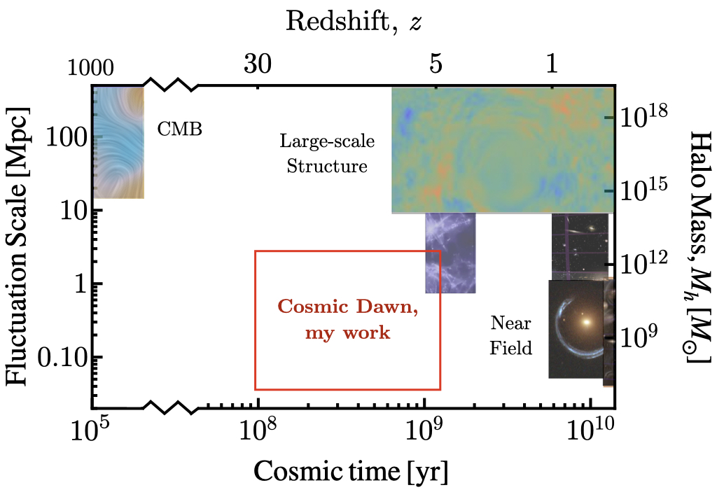 I’m broadly interested in early-universe astrophysics and cosmology. My recent work has been on understanding the epochs of cosmic dawn and reionization, especially on how the first galaxies formed on dark-matter halos and contributed to reionization. In short, my work aims to fill the gap on how structure forms at small scales and early times in the universe, as in the figure below (from Sabti, JBM+2021). This program will complete our picture of how dark matter grew structures from the Big Bang until today, using data from cutting-edge facilities like JWST, HERA, and HETDEX.