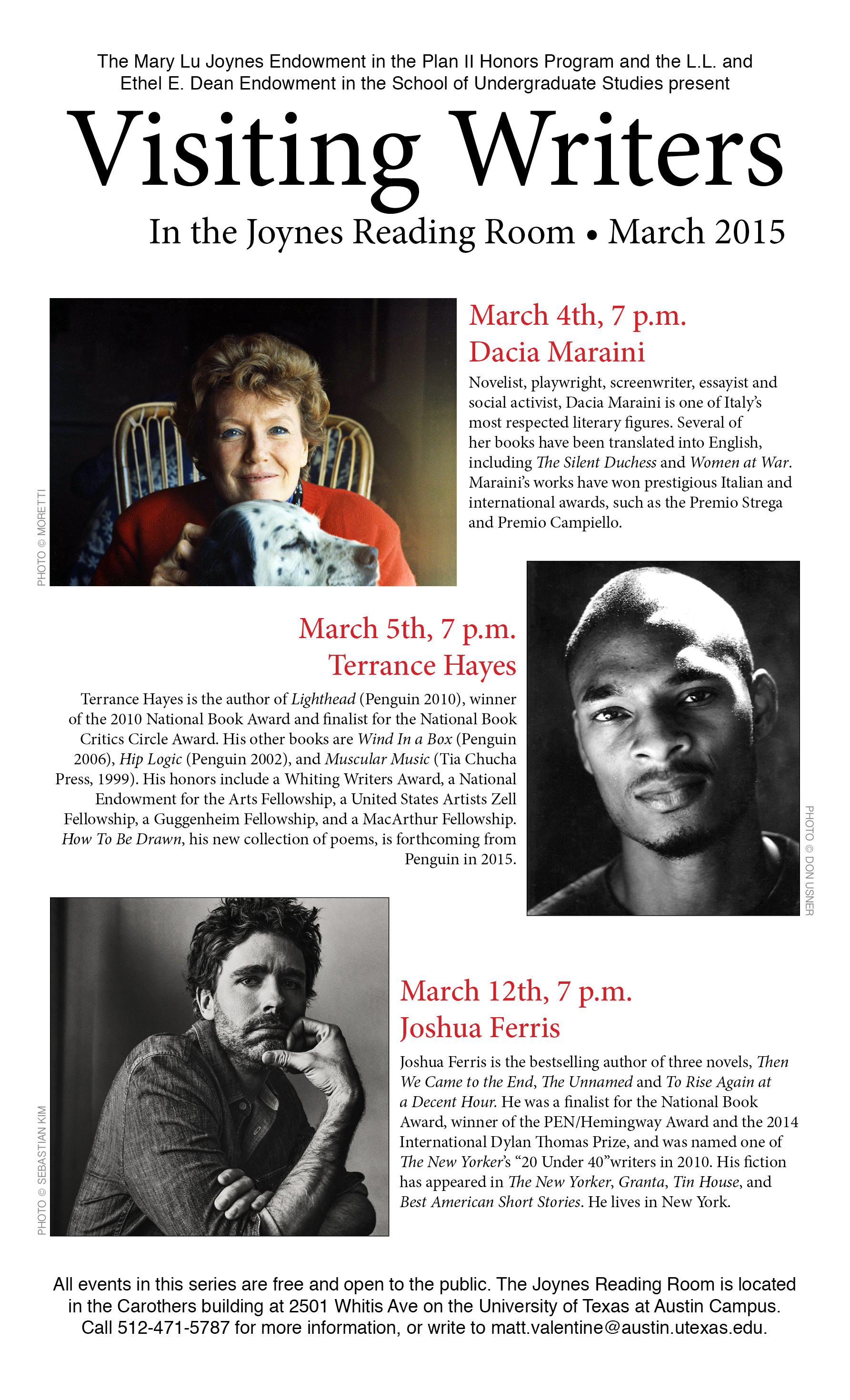 Please note that honors students are eligible to claim FREE BOOKS by these visiting writers (while supplies last). Interested students should inquire in person at the front desk of the Joynes Reading Room (CRD 007).