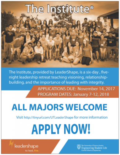 Engineering Student Life is hosting a great professional development opportunity for undergrad students of ALL MAJORS. Enhance your soft skills (communication, teamwork, ethical decision-making, etc.), build your resume, increase your confidence to lead in all aspects of your life, and meet other motivated students.