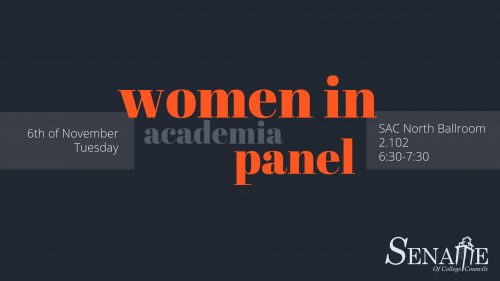 On Tuesday November 6th the Senate of College Council’s Faculty Affairs committee will host “Women in Academia Panel”. At the event panelists will be discussing what it means to be a woman in academia, how being a woman has impacted their professional lives, as well as many other things. The event is completely free to attend! There will also be Tiff’s Treats and giveaways.