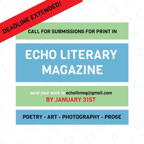 Attention all artists and writers, Echo Literary and Arts Magazine is now accepting undergraduate submissions in the categories of prose, poetry, art, and photography. Additionally, all LAHers are eligible to participate in our writing contest, in which the winners will receive publication in the magazine and a small scholarship! Please send all submissions to echolitmag@gmail.com by Friday January 31st! Submissions guidelines can be found at echoliterarymagazine.com. We look forward to receiving your work!