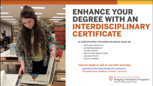 If you are not familiar with the BDPs, our programs offer undergraduates at UT the opportunity to pursue an interdisciplinary certificate to complement their major. BDP certificates integrate coursework with internship and research experiences and can be individualized to suit students’ goals. Students choose from one of 16 different interdisciplinary themes. You can view a list of all BDP topics, as well as more information about our programs, on our website.
