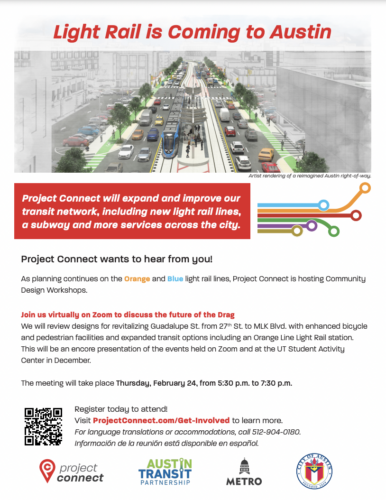 You may remember the on-campus Community Design Workshop hosted by Project Connect this past December regarding the proposed light rail coming to Guadalupe just west of campus.