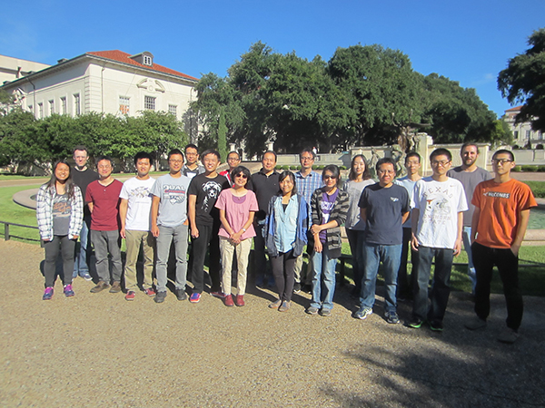 2014-2017 2014 – Photo not available Members Eta Isiorho, Chia-I Lin, Ke-Yi Lin, Anthony Romo, Mel Cheng-hao Liu, Grace He Sun, Meilan Wu, Hak Joong Kim, Byung-sun Jeon, Yeonjin Ko, Geng-Min Lin, Jung-Kuei Chen, Asoshu Zhong, Shao-An Wang, Richiro Ushimaru, Jon Gengler New Members: Yu-Cheng Yeh Post Doc: Reid McCarty Research Associates: Yung-nan Liu, Mark Ruszczycky Undergrad: Graduated: Eta Isiorho (Ph.D.), Meilan Wu (Ph.D.) Summer, 2015 (by Charles Umlauf) In front of the Torchbearers, University of Texas at Austin Members Chia-I Lin, Ke-Yi Lin, Anthony Romo, Hak Joong Kim, Byung-sun Jeon, Yeonjin Ko, Geng-Min Lin, Jung-Kuei Chen, Shao-An Wang, Aoshu Zhong, Richiro Ushimaru, Jon Gengler, Yu-Cheng Yeh New Members: Ronald Besandre, Zhang Chen, Jiawei Zhang Post Doc: Reid McCarty Research Associates: Yung-nan Liu, Mark Ruszczycky Undergrad: Reagan Bandy, Jessi Cai Graduated: Chia-I Lin (Ph.D.), Ke-Yi Lin (Ph.D.) Early Fall, 2016 (by Pompeo Coppini) In front of the Littlefield Fountain, University of Texas at Austin Members Byung-sun Jeon, Yeonjin Ko, Geng-Min Lin, Jung-Kuei Chen, Shao-An Wang, Aoshu Zhong, Richiro Ushimaru, Yu-Cheng Yeh, Ronald Besandre, Zhang Chen, Jiawei Zhang New Members: Wen-Ling Lin, Daan Ren, Yu-Hsuan Lee Post Doc: Research Associates: Yung-nan Liu, Mark Ruszczycky Undergrad: Priscilla Liem Graduated: Anthony Romo (Ph.D.), Hak Joong Kim (Ph.D.), Jon Gengler (M.S.) Early Fall, 2017 The UT tower, University of Texas at Austin Members Jung-Kuei Chen, Shao-An Wang, Aoshu Zhong, Richiro Ushimaru, Yu-Cheng Yeh, Ronald Besandre, Zhang Chen, Jiawei Zhang, Wen-Ling Lin, Daan Ren, Yu-Hsuan Lee New Members: Po-Hsun Fan, Ritwik Kumar Post Doc: Yujie Geng Research Associates: Yung-nan Liu, Mark Ruszczycky Undergrad: Geovanny A Zarceno Graduated: Byung-sun Jeon (Ph.D.), Yeonjin Ko (Ph.D.), Geng-Min Lin (Ph.D.)