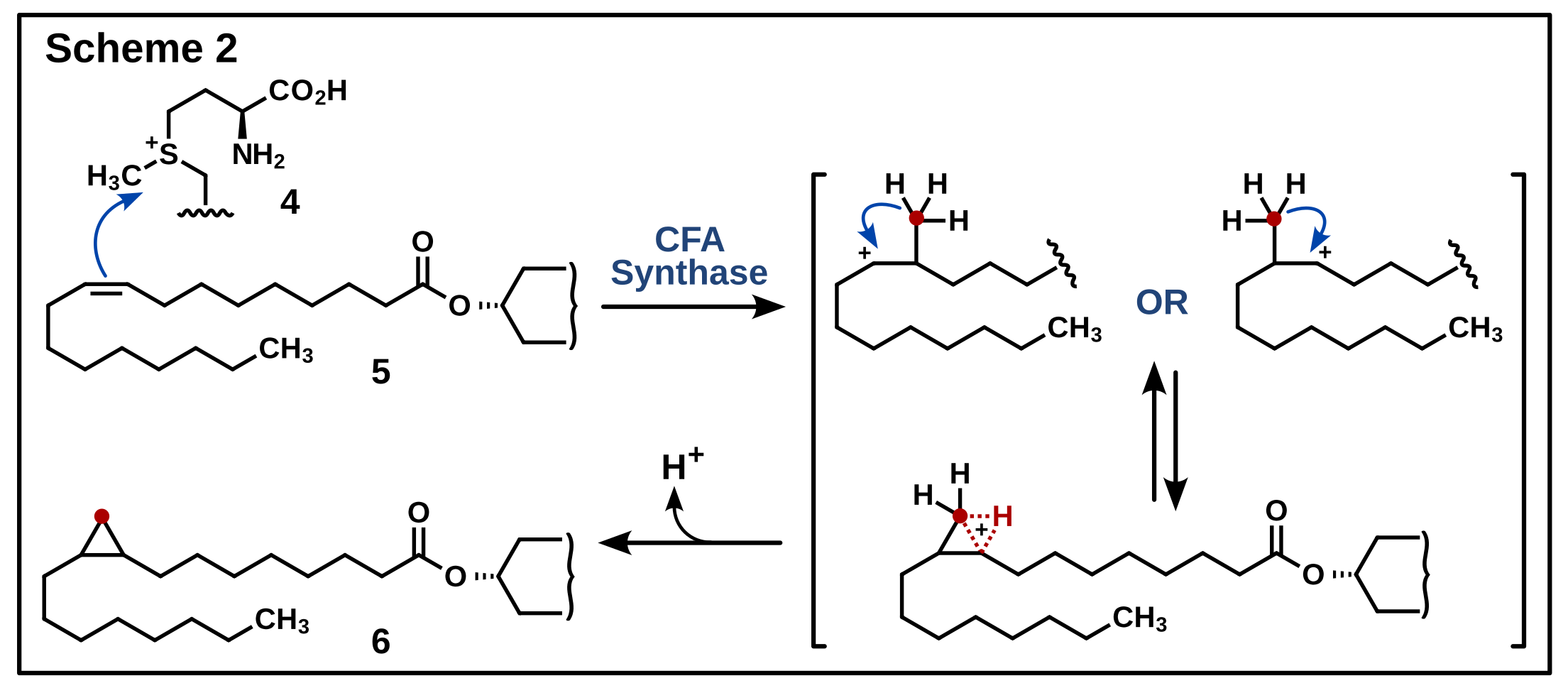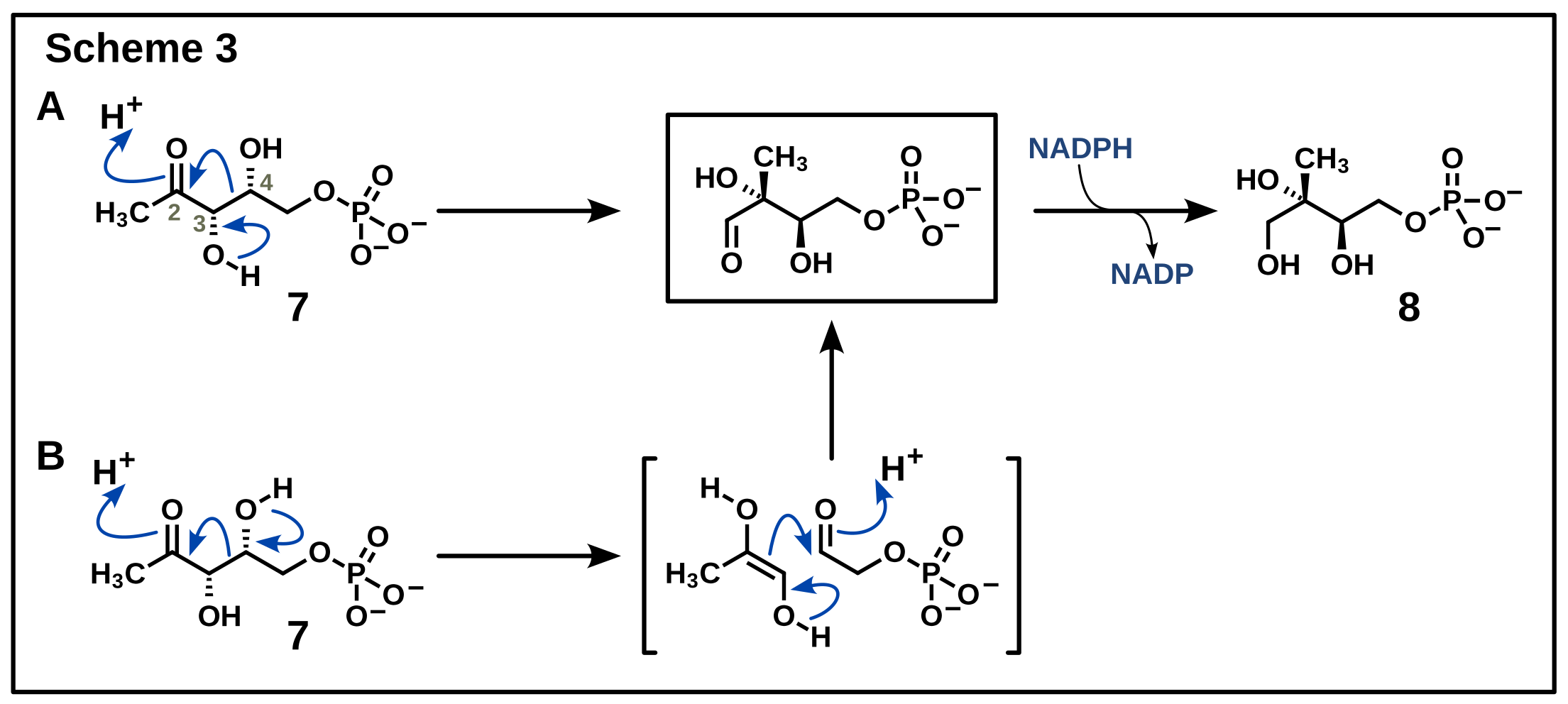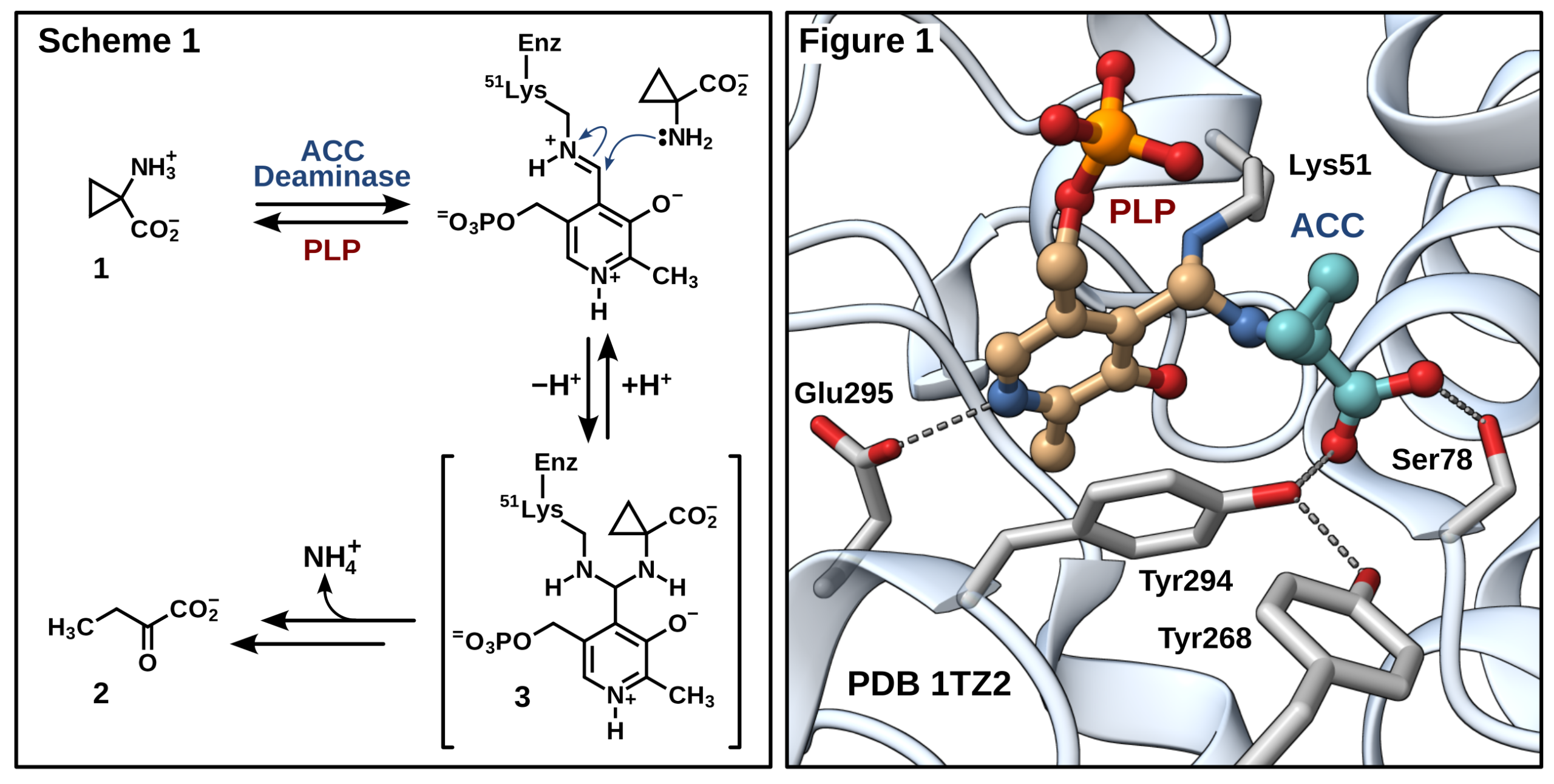 Mechanistic Enzymology & Inhibitor Design Mechanistic Studies of Novel Enzymatic Transformations and Inhibitor Design 1-Aminocyclopropane-1-carboxylate (ACC) Deaminase ACC deaminase (ACCD) is a pyridoxal-5′-phosphate (PLP) dependent enzyme that opens the cyclopropane ring of ACC (1), yielding α-ketobutyrate (2) and ammonia as the reaction products (Scheme 1). The mechanism of the cyclopropane ring opening is intriguing because it involves the cleavage of a Cα-Cβ bond, through an unprecedented mode of vitamin B6 catalysis. The cleavage of a Cα-Cβ bond by a PLP-dependent enzyme is a rare event, being observed in only one other enzyme, serine transhydroxymethylase. A stereochemical analysis of the ACC deaminase reaction led us to initially propose a mechanism involving the nucleophilic addition of an active site amino acid onto the pro-S methylene carbon of the cyclopropane ring. However, recent crystal structures of ACC deaminase in complex with ACC and its analogues have revealed the presence of a gem-diamine intermediate (3) in the active site, where both the Schiff base-forming lysine residue and the substrate amino group are covalently linked to the PLP cofactor (Figure 1). Furthermore, the structures implicate the involvement of a conserved active site tyrosine pair (Y268 and Y294) in catalysis. These observations have lead to another mechanistic proposal, in which Tyr294 acts as a general acid and facilitates ring cleavage directly from the stable gem-diamine intermediate (3). We are currently investigating the roles of this tyrosine pair and other active site amino acid residues in catalysis using a combination of site directed mutagenesis, steady state, and pre-steady state kinetic techniques. Cyclopropane Fatty Acid (CFA) Synthase The synthase from E. coli catalyzes the incorporation of a methylene group, derived from S-adenosyl methionine (4, S-AdoMet), across the C9-C10 double bond of the unsaturated membrane phospholipids (5, Scheme 2) to form a cyclorpropylfatty acyl chain (6). Sequence analysis has revealed that the E. coli CFA synthase is very similar to the cyclopropane mycolic acid (CMA) synthases of Mycobacterium tuberculosis, which catalyze similar S-AdoMet dependent reactions on mycolic acids. Mycolic acids are an integral component of this pathogen’s protective external barrier. Investigations into the mechanism of cyclopropane ring biosynthesis have suggested that catalysis proceeds through either a carbocation, or a protonated cyclopropane intermediate, perhaps via the assistance of a bicarbonate molecule bound at the active site. Currently, we are developing substrate analogues, inhibitors, and active site mutants to probe these potential mechanisms in more detail. Another interesting feature of the CFA synthase reaction is that it occurs on the lipid bilayer-cytosol interface. This enzyme must bring a soluble substrate (S-AdoMet) in close proximity to the C9-C10 double bond of the unsaturated fatty acid chains, which are buried in the phospholipid bilayer. The mechanism by which CFA synthase coordinates these interfacial processes is of interest to us, since only a few interfacial enzymes have been investigated in much kinetic or mechanistic detail. 1-D-Deoxyxylose-5-phosphate Reductoisomerase (DXR) We are also interested in two enzymes that are involved in terpenoid biosynthesis. Terpenoids (or isopreneoids) are a large family of compounds found in nearly all forms of life and serve in numerous cellular functions including defense, electron transport, and cell signaling. There are two biosynthetic routes to terpenoids: the mevalonate pathway, which is used by higher eukaryotes, archaea, and some eubacteria, and the non-mevalonate (or methyl erythritol) pathway, which is found only in plant chloroplasts and eubacteria. 1-D-Deoxyxylose-5-phosphate reductoisomerase (DXR) catalyzes the first committed step in the non-mevalonate pathway. It is a NADPH-dependent enzyme catalyzing the conversion of 1-deoxy-D-xylulose-5-phosphate (7, DXP) to methyl-D-erythritol 4-phosphate (8, MEP). DXR is a potential target of antibacterial agents because the non-mevalonate pathway is absent in humans. We are currently investigating the unusual rearrangement catalyzed by this enzyme. Two mechanisms have been proposed for the rearrangement reaction. One involves an α-ketol rearrangement (Scheme 3, route A), and the other utilizes a retroaldolization/aldolization mechanism (Scheme 3, route B). Our investigation of DXR involves the synthesis of fluorinated substrate and product analogues. These are then examined through rapid-quench and steady-state kinetic techniques to determine their ability to act as substrates or inhibitors of the reaction. Using the information garnered from these experiments, we will be able to design more specific inhibitors in the future, which have the potential to be clinically useful antibiotics. Isopentenyl Pyrophosphate (IPP) Isomerase Despite the great structural variation present in the 35,000 known terpenoids, they are all derived initially from the condensation of isopentenyl pyrophosphate (9, IPP) and dimethylallyl pyrophosphate (10, DMAPP). Thus, the interconversion between IPP and DMAPP by IPP isomerase (Scheme 4) is a critical step for the biosynthesis of all terpenoids. Recently, a new IPP isomerase (termed type II) was discovered in certain bacteria, including the pathogens Staphylococcus aureus, Streptococcus pneumonia, and Enterococcus faecalis. The type II IPP isomerase requires a flavin mononucleotide (FMN) cofactor, NADPH, and Mg2+ for activity, distinguishing it from the type I IPP isomerase, which uses acid-base chemistry to perform the isomerization. Because of these mechanistic differences, and because humans rely exclusively on the type I IPP isomerase, the type II enzyme is an attractive drug target. We have recently initiated a project to determine the mechanism of the type II isomerase from S. aureus and are analyzing the inhib