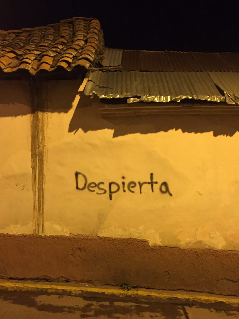 “Wake Up.” Graffiti on a wall in the center of Puno, Peru. This is a “collaborative” photograph, originally shot by Yoalli Rodríguez and reshot by Angela Tapia Arce with Yoalli at her side at the request of Portal’s editor. Rodríguez and Tapia are LLILAS PhD candidates. They were in Puno together after LASA2017, the Latin American Studies Association Conference in Lima.