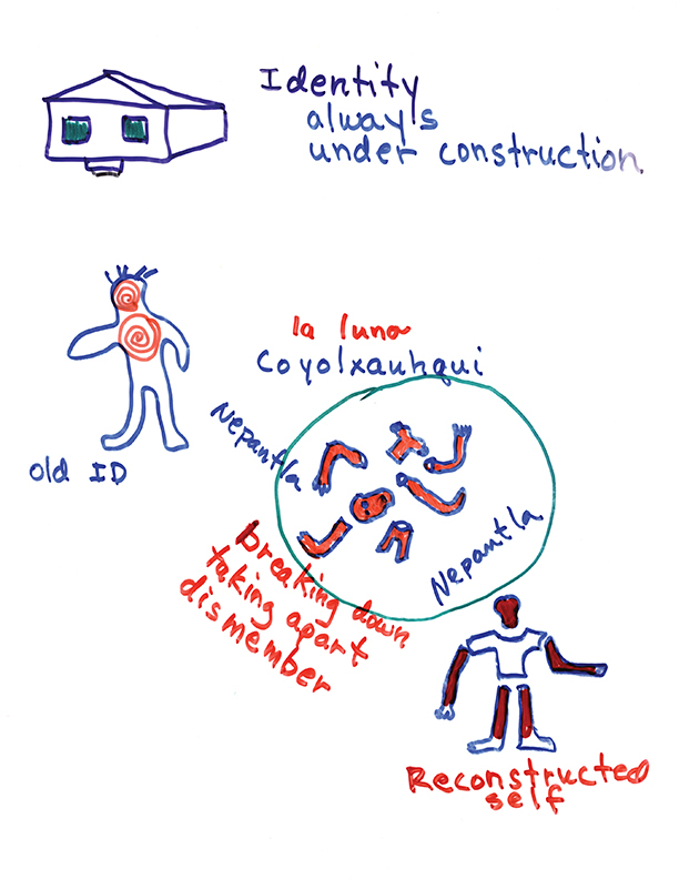 Anzaldúa writes about going through a “Coyolxauhqui process” with her body, and her body’s memory, every time she writes. She calls it painful, violent work. Writing, for her, consists of composing fragments, putting them here and there, changing them, fleshing them out. It makes her feel as though she is taking herself apart, dismembering herself “bone by bone” and putting herself back together. She describes it as a cycle of death and rebirth, for both author and work. This process for her is Nepantla, a journey between worlds, or a passing from one world to another.
