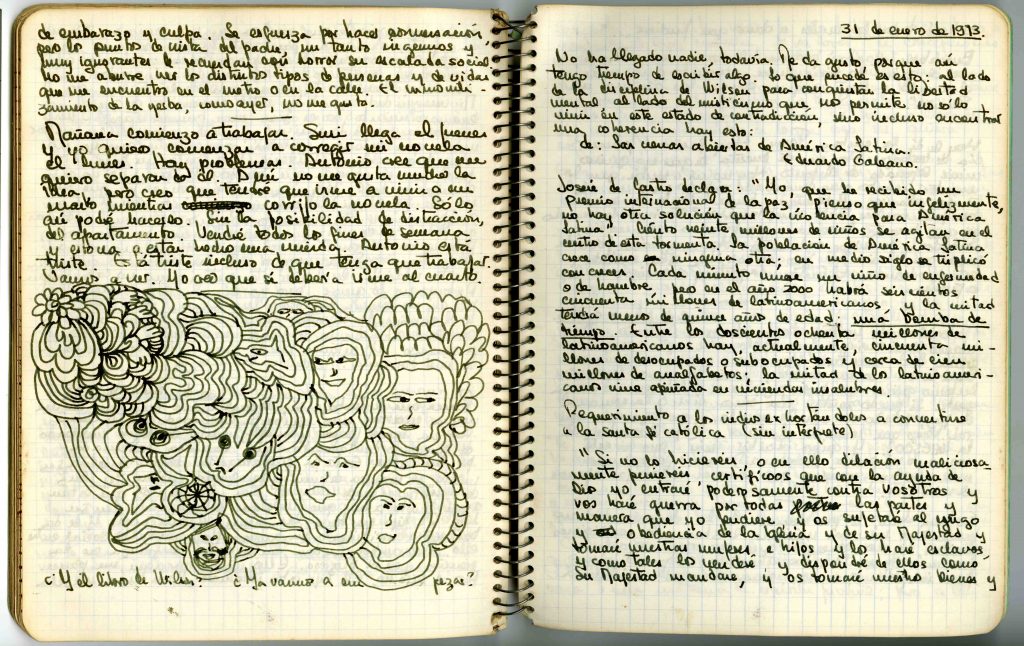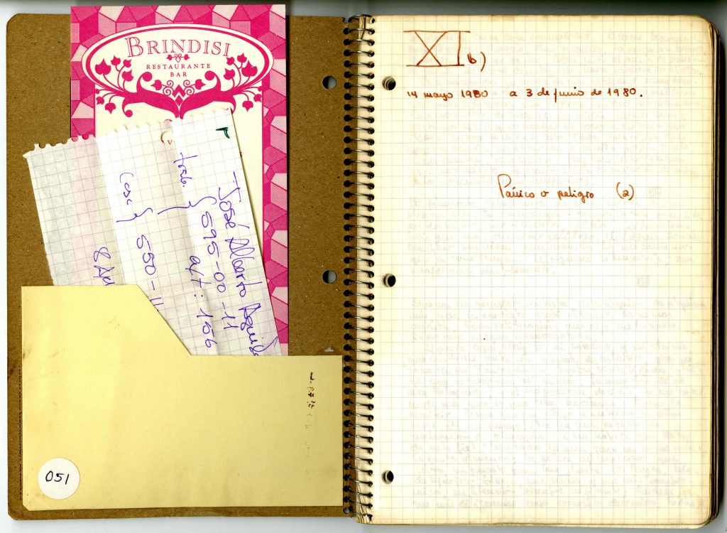 Muchos cuadernos contenían una hoja suelta con anotaciones que Puga hizo al releer sus diarios veinte años después de haberlos escrito. La novelista se mira como en un espejo que le devuelve una imagen antigua, inquieta, prolija, y reconoce núcleos de significado que iban cristalizando desde los años setenta: “Aquí se ve el problema de la pareja, de la escritura, de las ciudades, de la literatura,” escribe en una de las hojas sueltas, fechada en 1992. Hace también un poquito de aritmética: 1972 – 1944 = 28. Es decir: tenía yo 28 años al escribir aquel cuaderno. Se asoma a las etapas de Francia, Grecia, Italia, cuando leía a Musil, a Dostoievski, a Woolf, y cuando su plan de lectura constaba de los siguientes puntos: Frantz Fanon, arquitectura urbana, ensayos sobre América Latina, women’s lib y black power (Cuaderno 2, 27 de octubre de 1972).